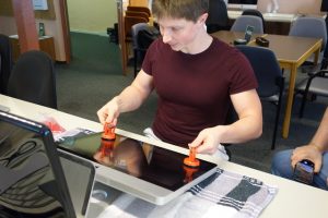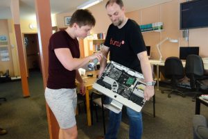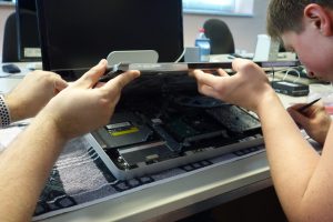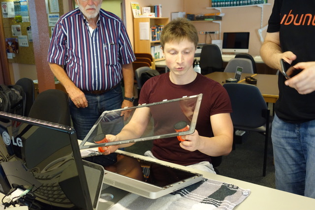 Mit Unterstützung von Jesper haben wir heute daher den defekten iMac geöffnet, die Platte ausgebaut und gegen eine gebrauchte, ebenfalls gespendete SSD getauscht. Beim Öffnen werden Saugnäpfe benötigt, da das Display von einer Glasplatte geschützt wird, welche mit Magneten gehalten wird.